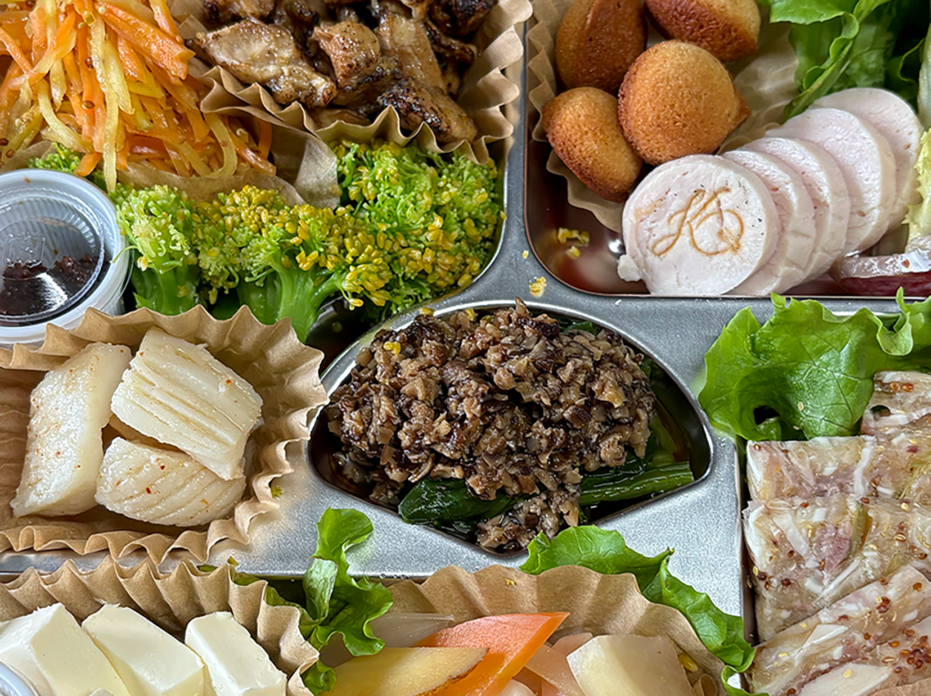 スモークサーモン、スパニッシュオムレツ、カラフルピクルスなど、人気の前菜約10種類を詰め合わせます。