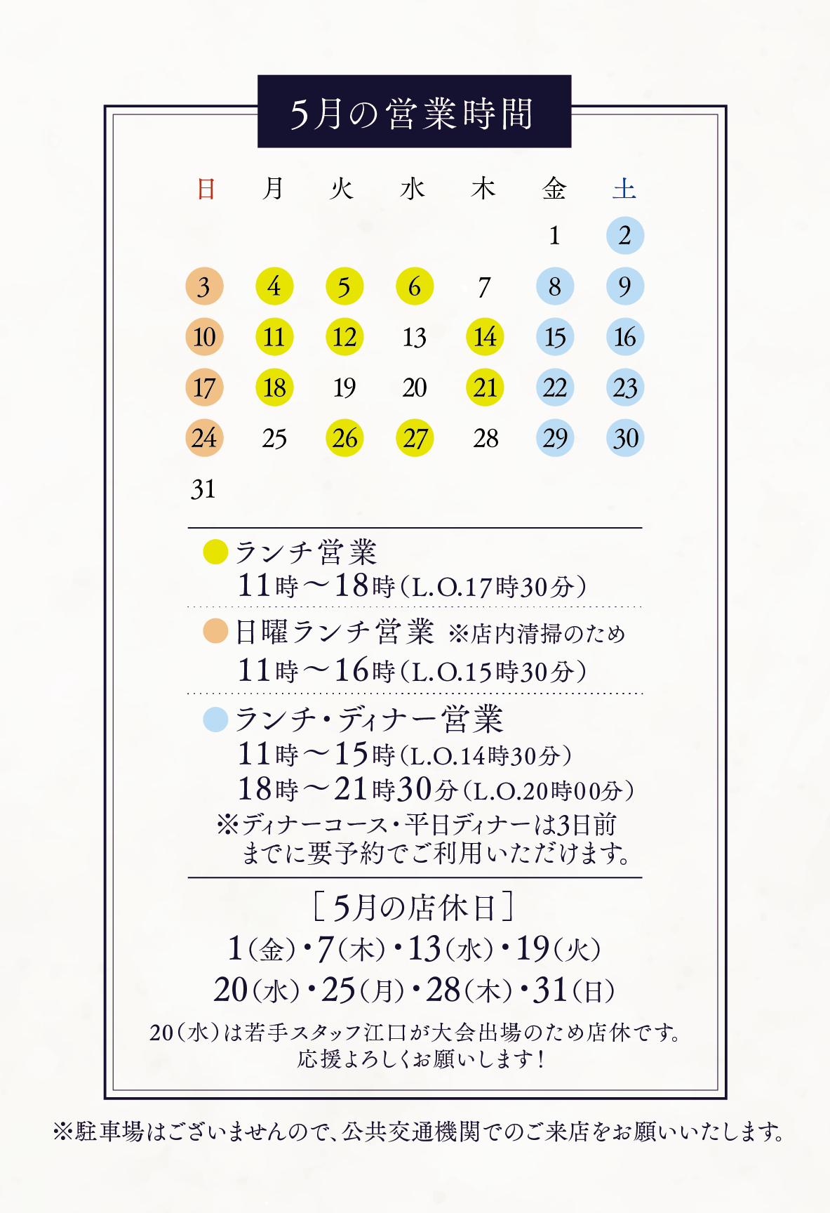 ご来店の際は、公共交通機関またはお近くのコインパーキングをご利用ください。